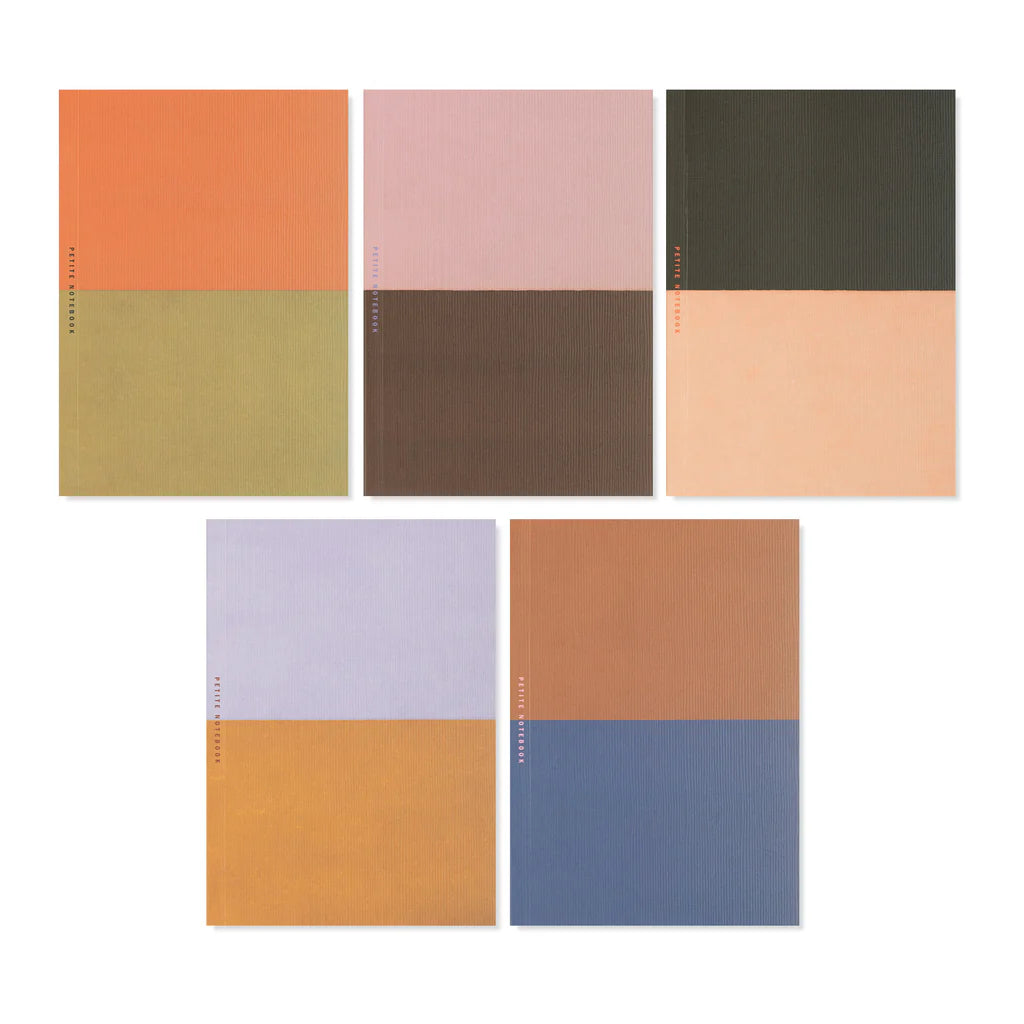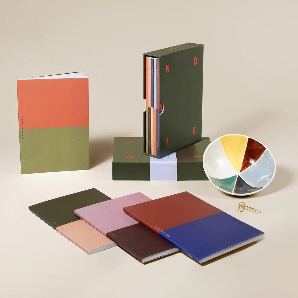 Este set de 5 diarios delgados presenta tapas de bolsillo texturizadas con un exclusivo diseño en bloques de color y detalles en relieve. Los diarios se presentan en una funda de papel con un diseño único y una abertura lateral para insertar y extraer fácilmente.