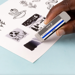 Elimina de forma segura las marcas de tinta y lápiz de color con el borrador de arena MONO, un borrador de látex de caucho natural con grano de sílice que no dañará el papel. El borrador de plástico MONO es un borrador de primera calidad que elimina de forma limpia las líneas de lápiz de grafito.